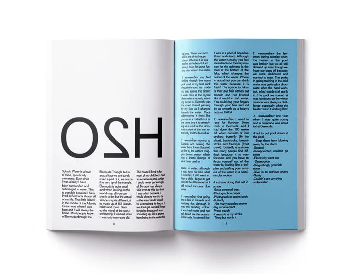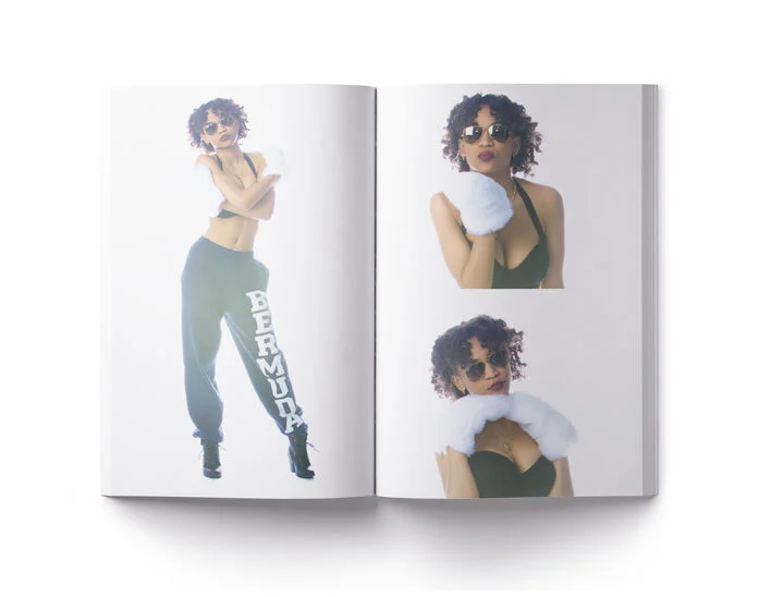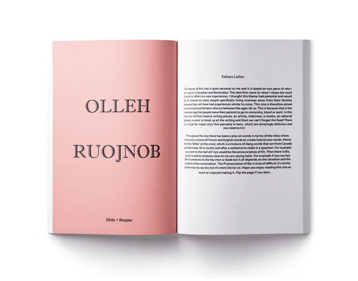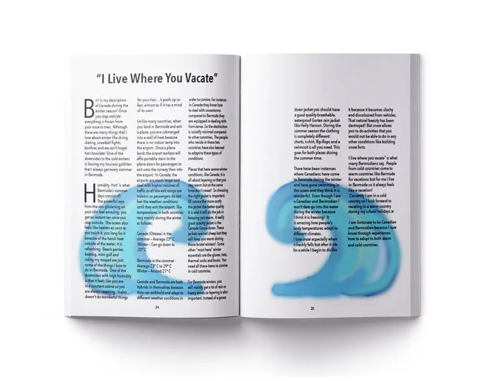 This was a project where we were required to create a zine based off a word from a word bank given. I chose the word HYBRID because I am both Bermudian/Canadian and wanted to make my zine quite personal. As a result, I was inspired by winter/summer which was combining the two climates that I associate Bermuda and Canada with. Canada is associated with the cold and Bermuda is associated with hot. I wanted to create a haze effect for the background to make it seem like it was winter. I made a contrast between the two elements by combining winter and summer clothes creating hybrid outfits therefore working with the theme of my zine. In addition, the title 'EhBie' is a combination of Canadian and Bermudian slang words.